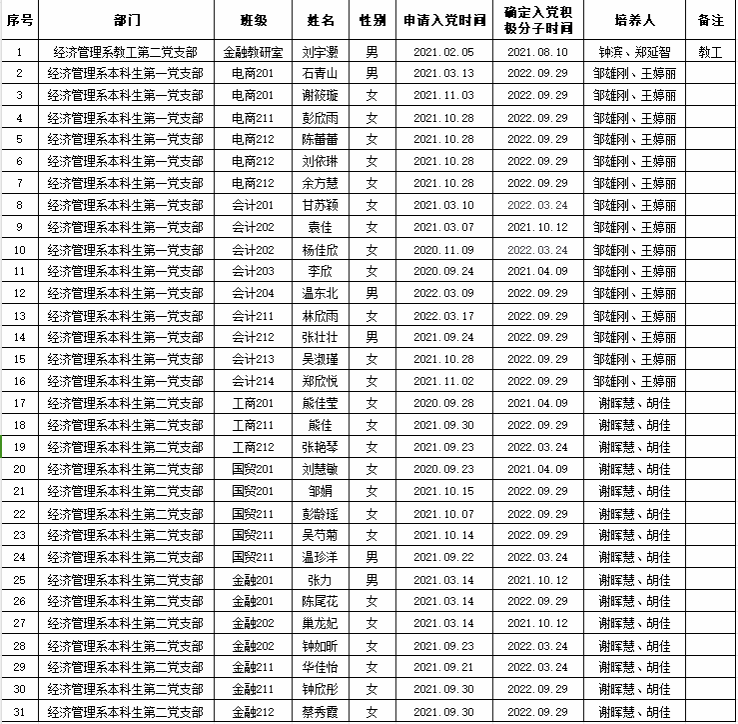 经党组织一年的培养考察,刘宇灏等31名同志被列为发展对象,为了进一步增强发展党员工作的透明度,加强对发展党员工作的民主监督,保证新发展党员的质量,现将2023年下半年发展对象刘宇灏等31名同志的有关情况公示如下: