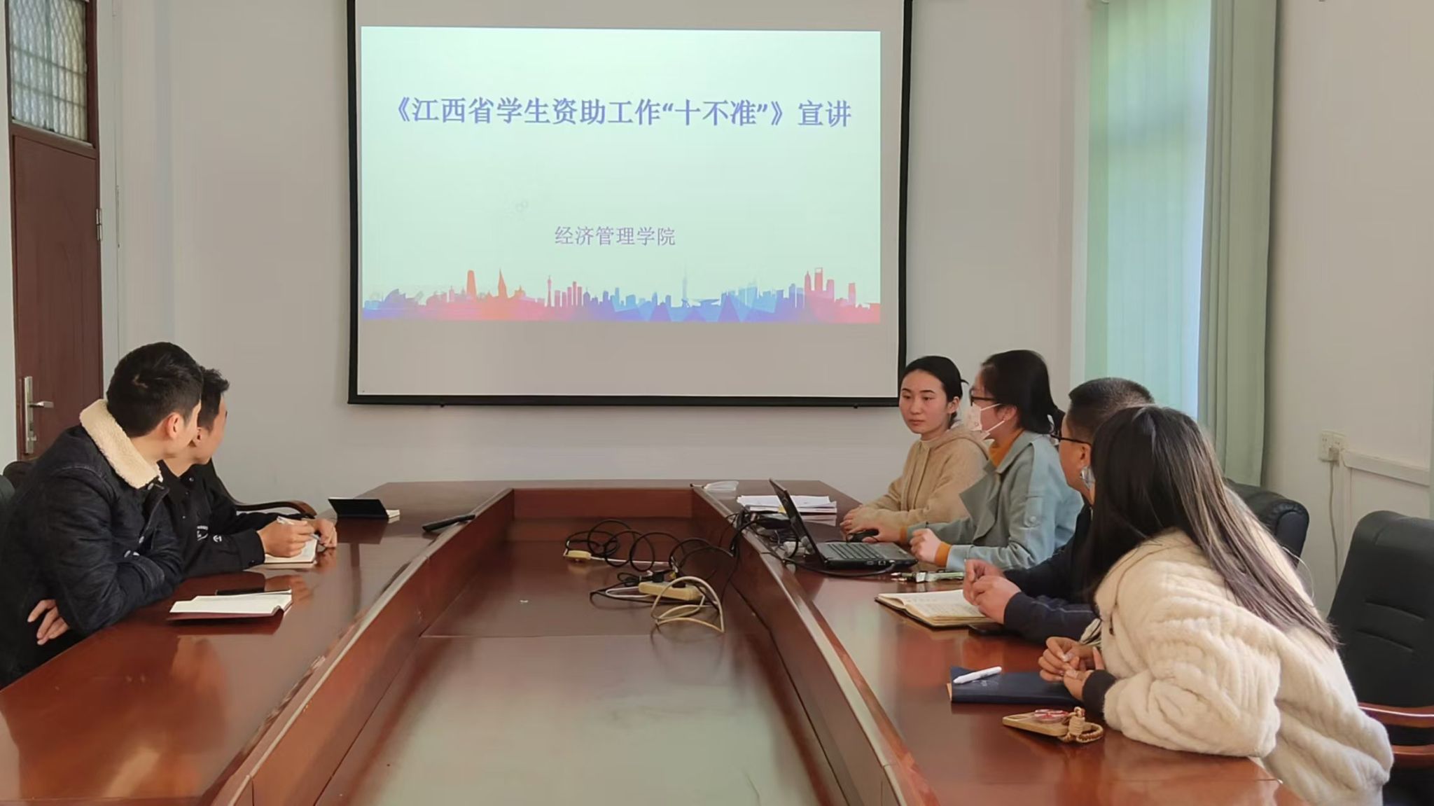 11月8日下午,今年会在309会议室开展“十不准”学习宣传,学院辅导员参加了本次会议。会上,经管学院学生工作负责人梁文学重点就《 江西省学生资助工作"十不准"(修订版)》重要意义进行了强调,并对评审环节、公示和资金发放环节进行了详细地讲解,进一步明确了学生资助工作"十不准"的政策红线和实践指导意义,要求各位辅导员增强对制度内容的学习宣传,形成制度意识,保证资助工作宣传到位、落实在心,切实按制度办事。