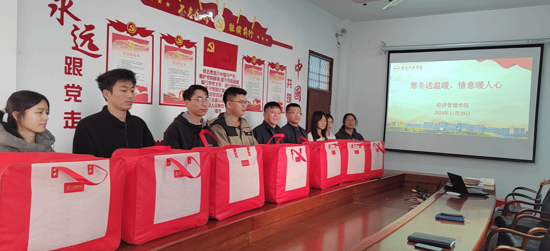 本网讯:随着冬季的脚步日益临近,气温逐渐走低,为了确保家庭经济困难学生在寒冷的冬季能够得到足够的关怀与温暖,11月29日,学院在2教309会议室开展寒冬送温暖行动,学院党委书记肖永鸿,学院党委委员梁文学以及全体辅导员出席本次活动。