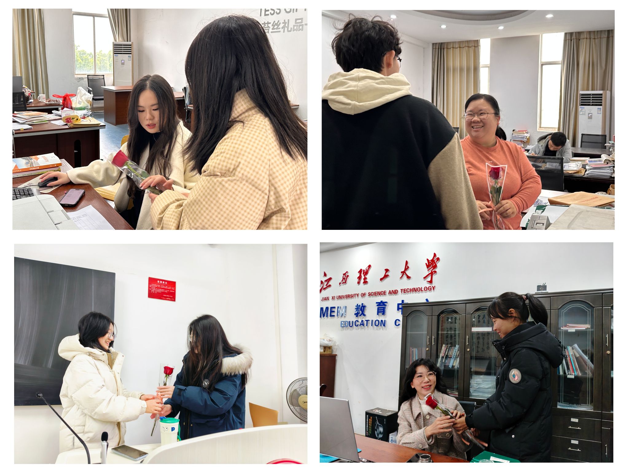 值此佳节,活动特增设“馨香敬师”环节深化师生情谊。学生代表手持寓意“耕耘育德”的玫瑰花束,前往教师办公区表达感恩,教师与学生在花束传递中合影留念。