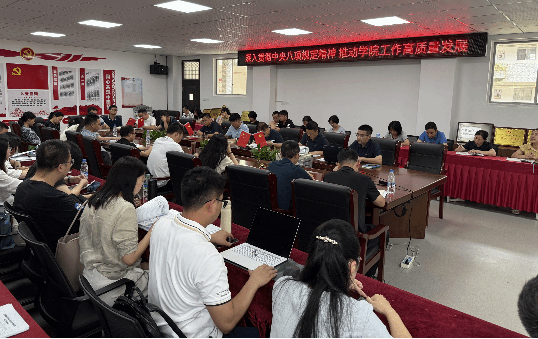 肖永鸿系统阐释了中央八项规定精神作为“长期有效的铁规矩、硬杠杠”的核心内涵与重大意义,回顾了党的十八大以来作风建设成效。随后,肖永鸿通报了学院目前开展深入贯彻中央八项规定精神学习教育的现状以及取得的成效,分析了仍存在的问题,如纪律意识、服务意识和主动担当等方面存在差距。