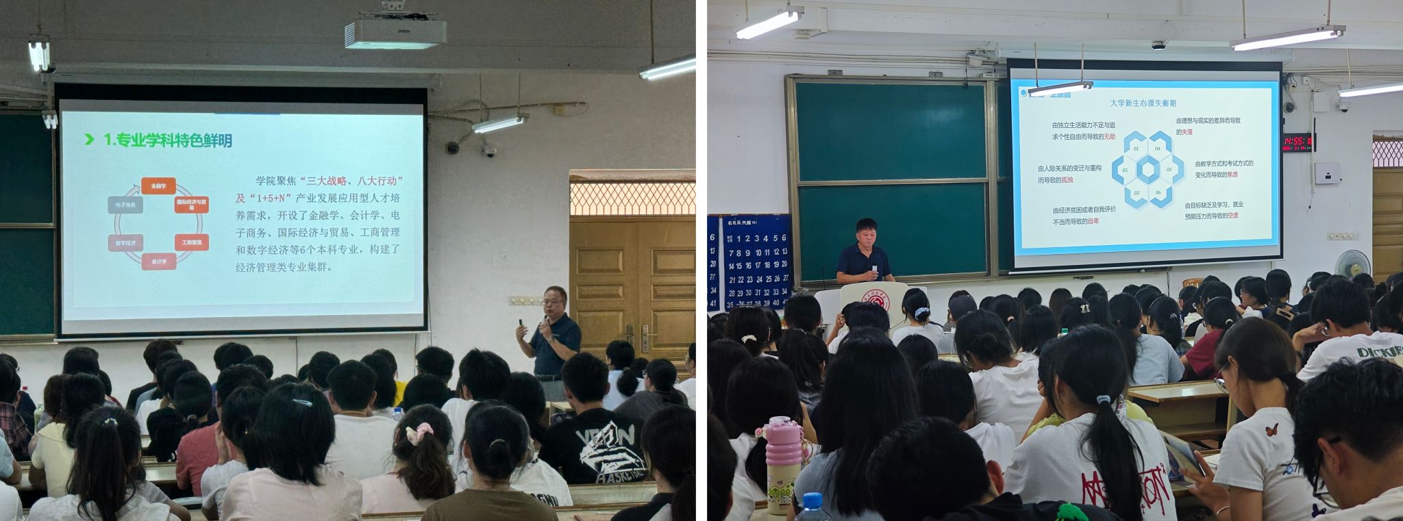 入学教育启动阶段,学院将新生思想引领与成长规划置于首位。9月13日下午,学院党委书记肖永鸿与党委委员、副院长钟滨联袂为新生带来成长成才主题辅导,从个人发展与学校认同双维度为新生领航。肖永鸿以“习惯养成、时间管理、创新能力培养、独立选择能力提升”为四大主线,聚焦新生个人成长核心需求,寄语新生着力增强自立能力、知识应用能力、人际交往能力与心理承受能力,通过综合素质的全面提升,主动适配未来社会发展需求,为大学四年及长远人生筑牢能力根基。钟滨通过鲜活案例与数据,引导新生深刻理解学校的发展脉络与办学特色,进而厚植爱校荣校情怀,将个人成长目标与学校发展紧密结合,点燃青春奋斗热情。