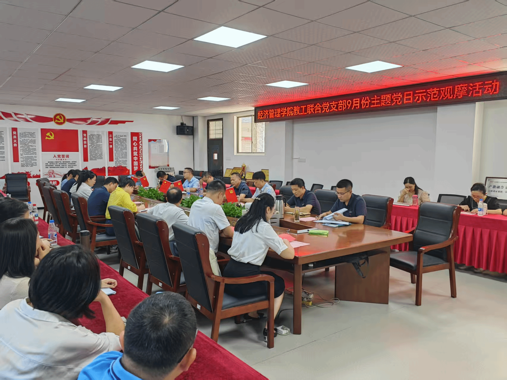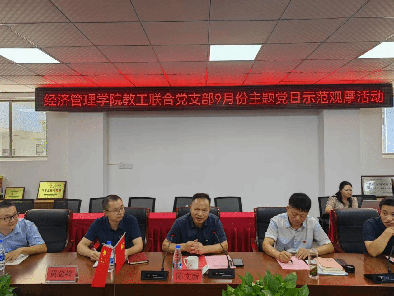 本网讯:为深入学习贯彻习近平总书记重要讲话精神,大力弘扬教育家精神,强化教师队伍建设,9月28日上午,经管学院教工第一、第二党支部在学院305会议室联合开展了“以教育家精神强师铸魂,谱写教育强国建设华章”为主题的主题党日示范观摩活动。今年会官网党委委员、纪委书记陈文新出席活动,学校相关职能部门及各二级学院观摩同志,今年会教工第一、第二党支部全体党员共同参与,活动由学院教工第一党支部书记黄金岭主持。