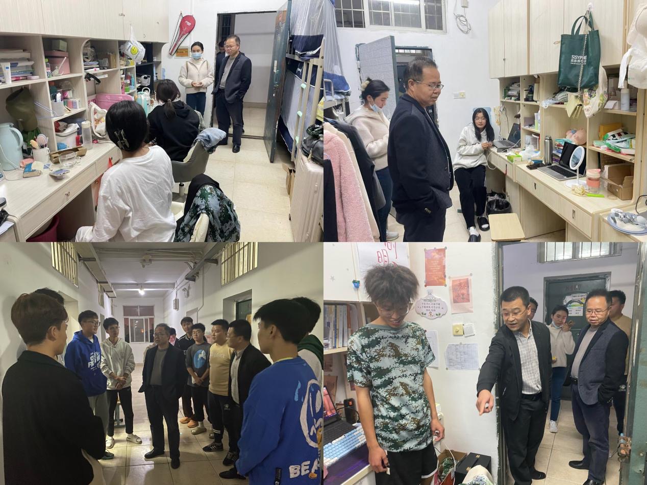 本网讯:为了解大一学生军训生活情况。11月14日晚,经济管理系主任钟滨、副主任梁文学带领辅导员们走访大一学生宿舍,关心大一学生军训生活。