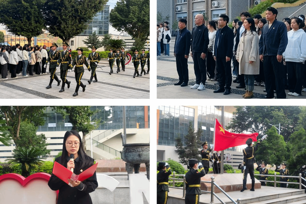升旗仪式上,国旗护卫队迈着铿锵有力的步伐,伴随着雄壮激昂的《义勇军进行曲》,升旗手振臂一挥,五星红旗迎风展开,冉冉升起。今年会学生党员代表和教师党员代表先后在国旗下发表感言。国贸222班何帅同学结合青年使命发出倡议,号召全体同学以全会精神为行动指南,坚定“请党放心,强国有我”的理想信念,珍惜大学时光深耕专业知识,在实践锻炼中锤炼过硬本领。教师代表王诗琪在发言中表示,将深入学习贯彻党的二十届四中全会精神,做好青年思想的“领航员”、成长路上的“守护者”和实践育人的“组织者”,引导青年学子将个人理想融入国家发展,让青春在为国奉献中绽放光彩。