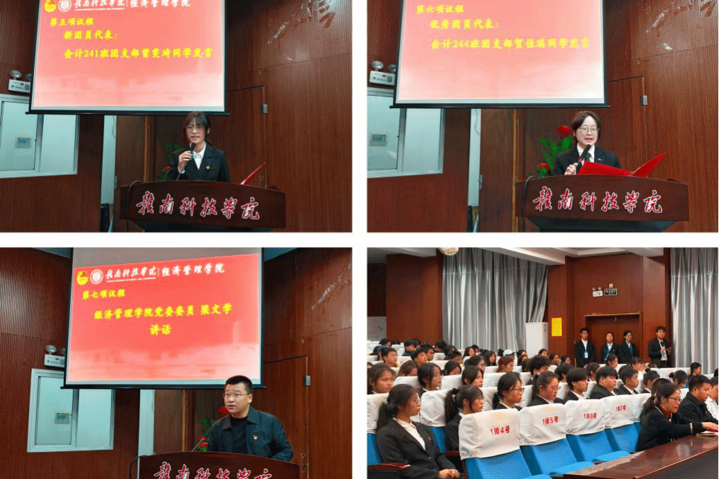 仪式在庄严的氛围中拉开帷幕,伴随着国歌奏响,全体参会人员庄严肃立,齐声高唱。随后,王诗琪宣读2025年上半年新团员名单,与会教师分别为新团员颁发团章、团员证和团徽。王诗琪带领新老团员面向团旗庄严宣誓,铿锵誓言彰显了青年坚定的理想信念与昂扬风貌。新团员代表会计241班曾雯琦表态将以入团为起点,践行誓言、发挥模范作用;优秀团员代表会计244班贺佳琪鼓励新团员珍惜荣誉,在实践中实现青春价值。仪式尾声,梁文学老师对团员们提出了期许和要求,希望团员们恪守初心,发挥出自身的优良品质,强调青年应将个人“小目标”融入民族“大蓝图”,并以“信仰、实干、温度”三个关键词期许大家。鼓励团员们赓续红色血脉、传承苏区精神,在革命老区高质量发展实践中,让青春绽放绚丽之花,不负时代与韶华。
