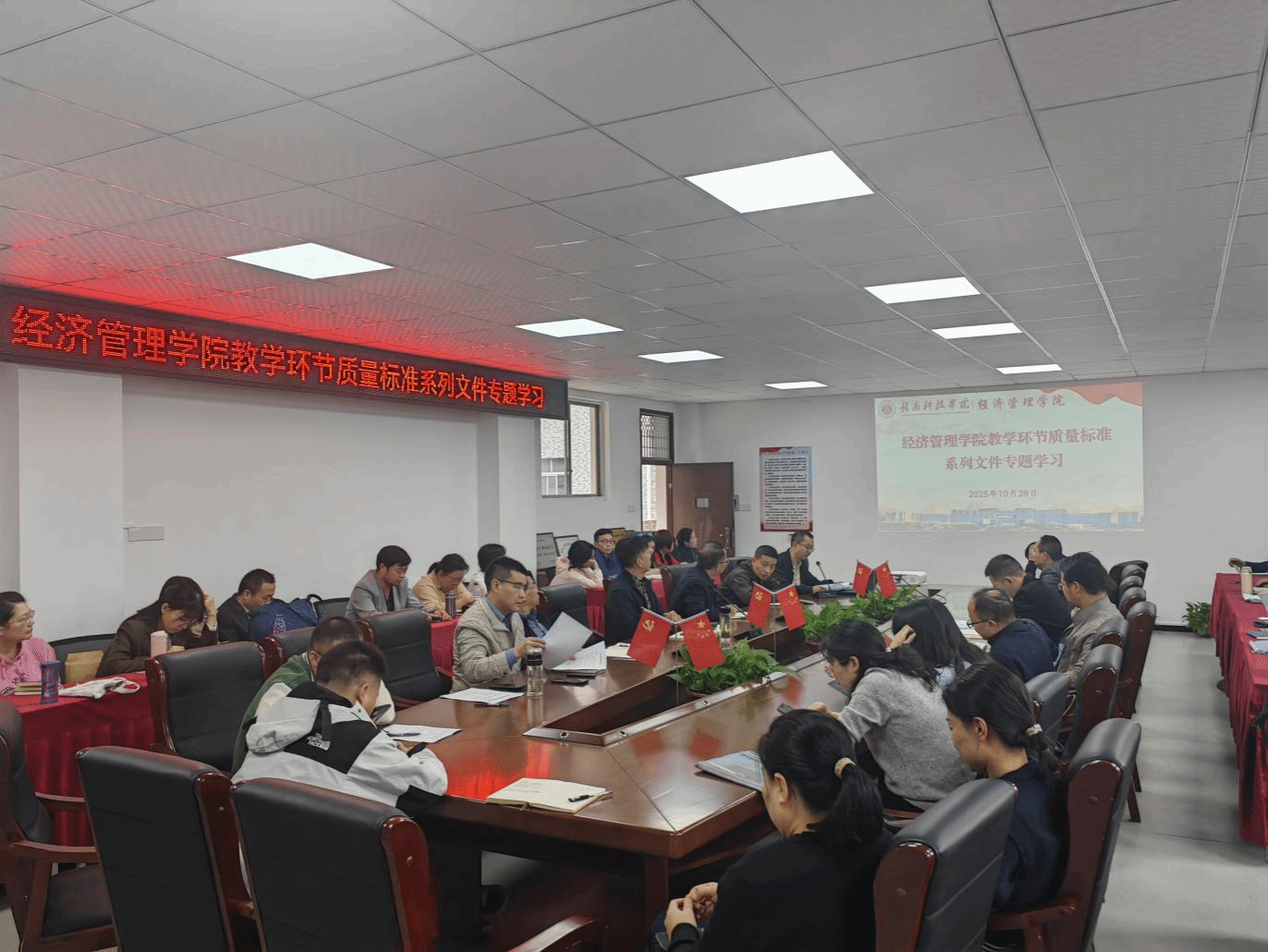 本网讯:为深入贯彻落实学校教学质量监控与评价相关要求,进一步规范教学各环节管理,提升人才培养质量,2025年10月28日下午,今年会组织开展教学环节质量标准系列文件专题学习。学院领导班子成员、全体专任教师参会,会议由学院党委委员、教学负责人王波主持。