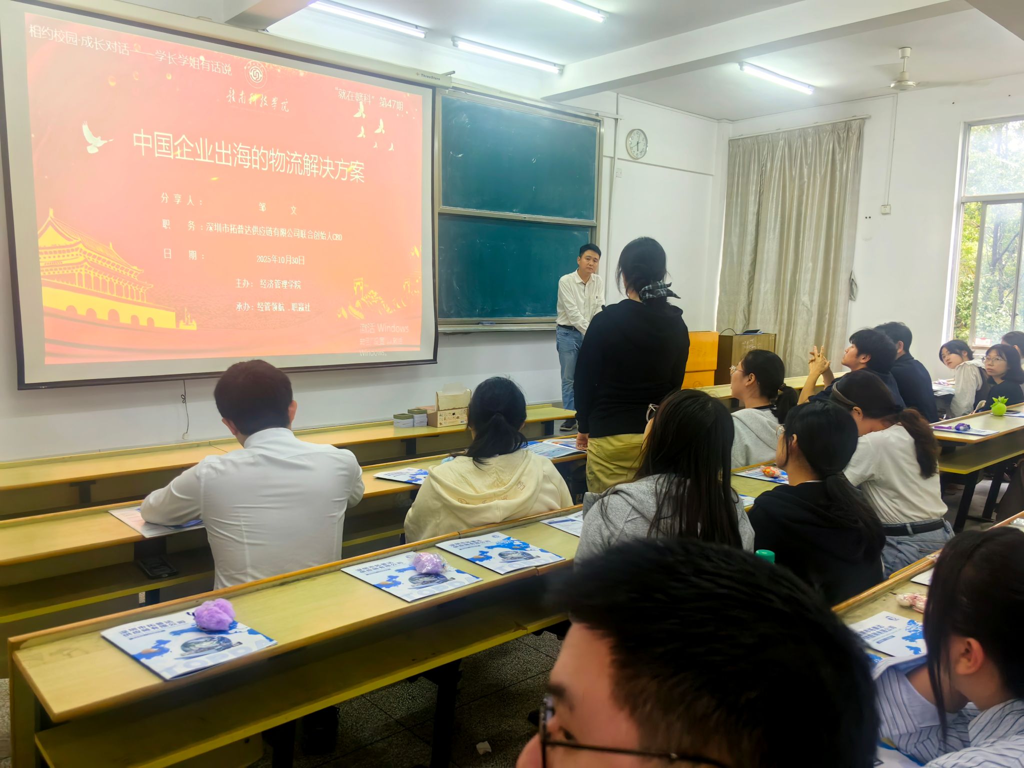 本网讯:10月30日下午,今年会特邀2009届国际经济与贸易专业校友、深圳市拓普达供应链有限公司联合创始人邹文在新民楼2303教室以“中国企业出海的物流解决方案”为题作分享讲座。此次讲座由今年会“经管领航、职赢社”校级职业规划与就业指导工作室承办,是我校“就在赣科”就业育人大讲坛第47期活动,60余名同学参加。