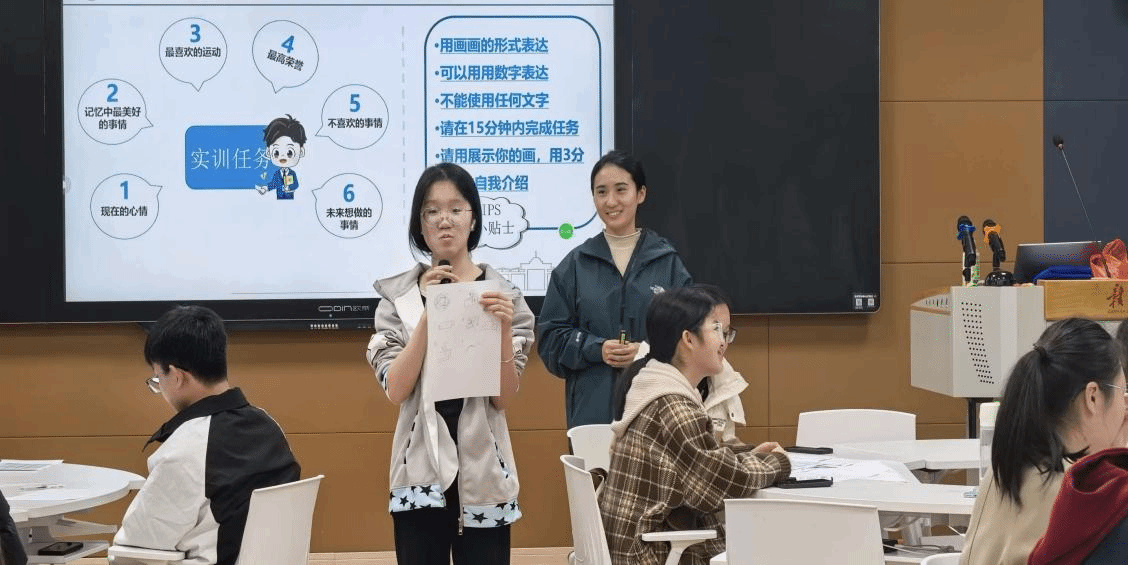 针对困难学生普遍存在的表达不自信、技能展示不突出等问题,培训还设置互动实践环节。学生们通过绘制《我的6维自我介绍图》并上台展示,逐步增强自我认知与表达勇气,现场气氛积极活跃。