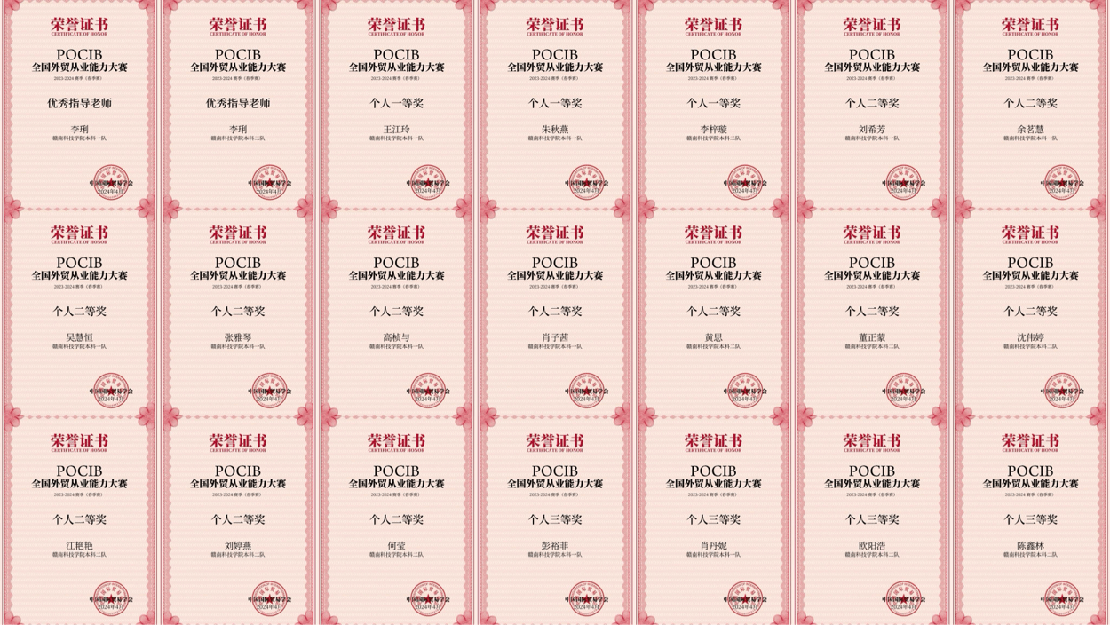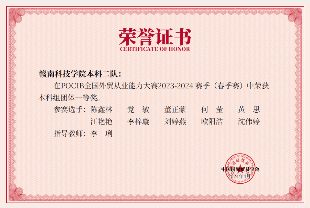本网讯:近日,由中国国际贸易学会主办的第十三届POCIB全国外贸从业能力大赛(春季赛)落下帷幕。赛事从4月7日至19日历时13天,共计295所院校、886支队伍、8860名选手参加。今年会官网国际经济与贸易专业21级20名学生组成两队参赛,取得一队本科组团体特等奖、二队本科组团体一等奖、个人奖19项的优异成绩。李琍老师获“优秀指导老师”荣誉称号。