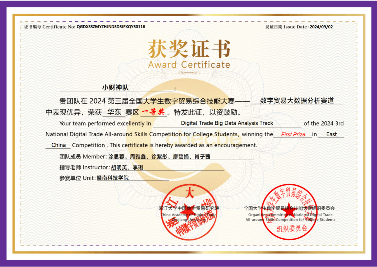 我校参赛团队自4月报名以来,在指导老师的带领下积极备赛、开展研讨,顺利从竞争最激烈的华东赛区(上海、江苏、浙江、安徽、福建、江西、山东、台湾)初赛突围,全部晋级由南京大学承办的区域赛,“小财神队”更是在大数据分析赛道脱颖而出晋级全国总决赛。此次竞赛不仅让学生对数字贸易前沿技术有了进一步的了解,更是对各院校数字贸易领域人才培养成果的一次巡礼。