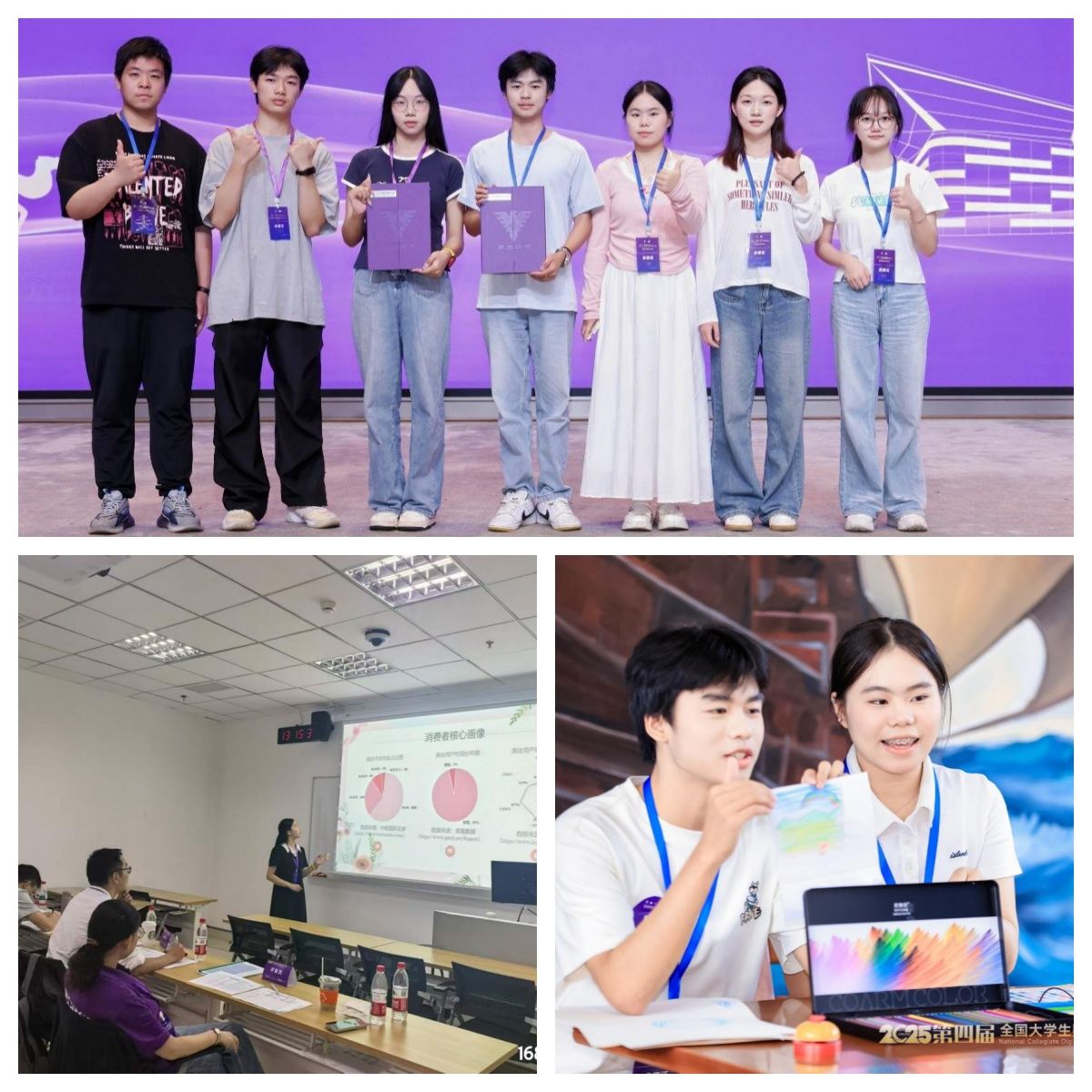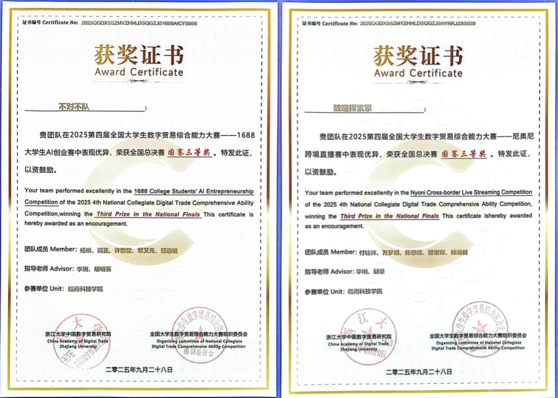本网讯:9月26日—28日,“2025年第四届全国大学生数字贸易综合能力大赛”之1688大学生AI创业赛、尼奥尼跨境直播大赛全国总决赛分别在浙江大学紫金港校区、浙江外国语学院举行。今年会官网李琍、胡明英两位老师指导的“不对不队”喜获国家三等奖,参赛学生由会计233班杨晰、会计233班简正、国贸242班许思莹、通信231班章又元、工商231班范语培等五位同学组成。邱景、李琍两位老师指导的“数趣探索家”团队喜获国家三等奖,参赛学生由英语232班付桂祥、方梦娟和数字经济242班陈思晴、曾泔甯、邱涵哲等五位同学组成。