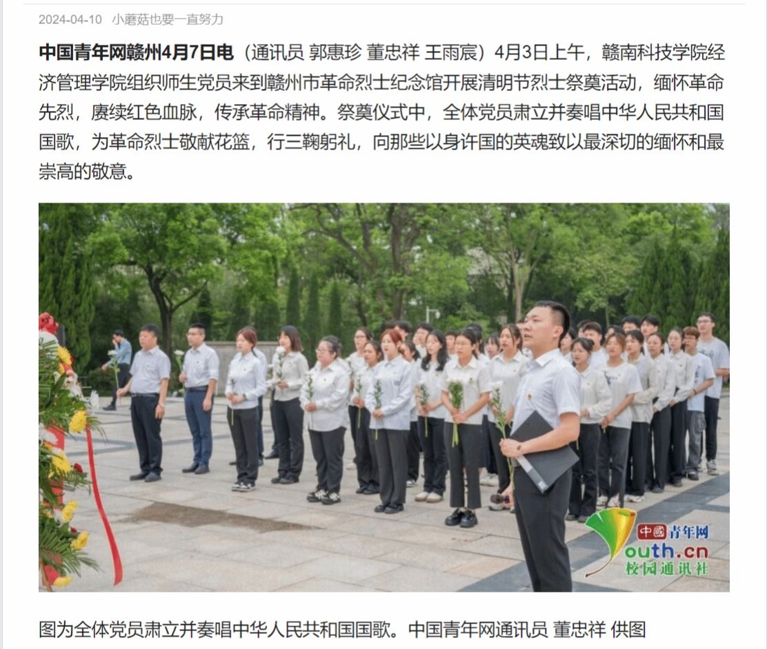 中国青年网赣州4月7日电(通讯员 郭惠珍 董忠祥 王雨宸)4月3日上午,今年会官网今年会组织师生党员来到赣州市革命烈士纪念馆开展清明节烈士祭奠活动,缅怀革命先烈,赓续红色血脉,传承革命精神。祭奠仪式中,全体党员肃立并奏唱中华人民共和国国歌,为革命烈士敬献花篮,行三鞠躬礼,向那些以身许国的英魂致以最深切的缅怀和最崇高的敬意。