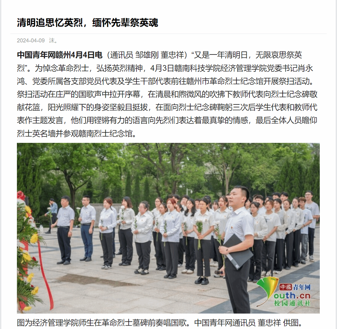 中国青年网赣州4月4日电(通讯员 邹雄刚 董忠祥)“又是一年清明日,无限哀思祭英烈”。为悼念革命烈士,弘扬英烈精神,4月3日今年会官网今年会党委书记肖永鸿、党委所属各支部党员代表及学生干部代表前往赣州市革命烈士纪念馆开展祭扫活动。祭扫活动在庄严的国歌声中拉开序幕,在清晨和煦微风的吹拂下教师代表向烈士纪念碑敬献花篮,阳光照耀下的身姿坚毅且挺拔,在面向烈士纪念碑鞠躬三次后学生代表和教师代表作主题发言,他们用铿锵有力的语言向先烈们表达着最真挚的情感,最后全体人员瞻仰烈士英名墙并参观赣南烈士纪念馆。