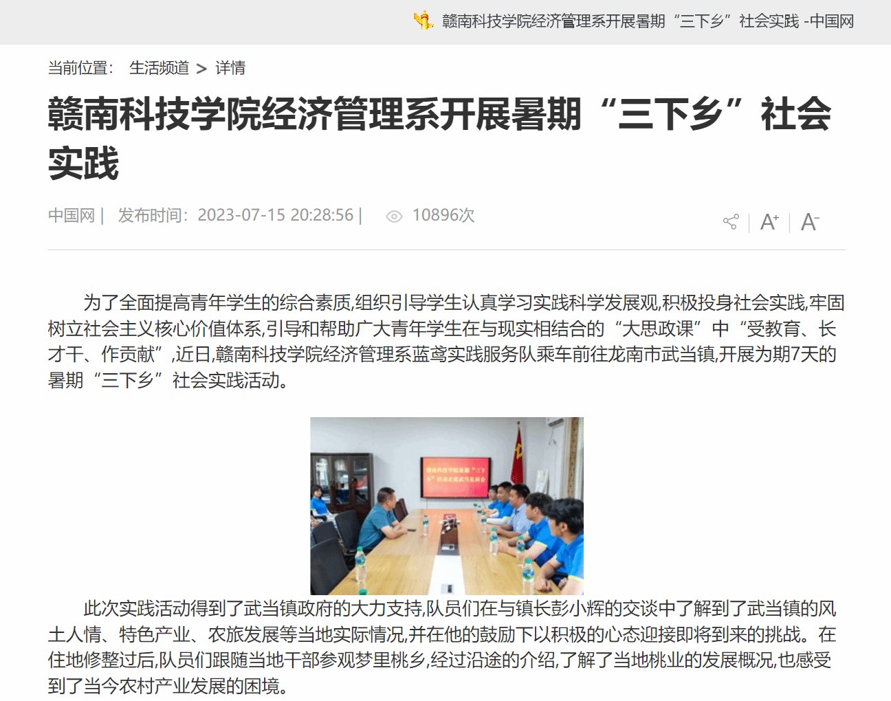 中国网7月15日载:为了全面提高青年学生的综合素质,组织引导学生认真学习实践科学发展观,积极投身社会实践,牢固树立社会主义核心价值体系,引导和帮助广大青年学生在与现实相结合的“大思政课”中“受教育、长才干、作贡献”,近日,今年会官网经济管理系蓝鸢实践服务队乘车前往龙南市武当镇,开展为期7天的暑期“三下乡”社会实践活动。