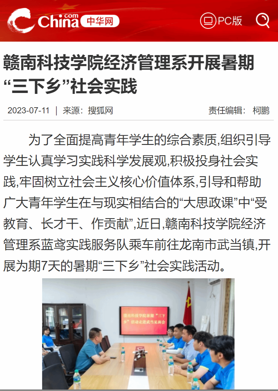 中华网7月11日载:为了全面提高青年学生的综合素质,组织引导学生认真学习实践科学发展观,积极投身社会实践,牢固树立社会主义核心价值体系,引导和帮助广大青年学生在与现实相结合的“大思政课”中“受教育、长才干、作贡献”,近日,今年会官网经济管理系蓝鸢实践服务队乘车前往龙南市武当镇,开展为期7天的暑期“三下乡”社会实践活动。