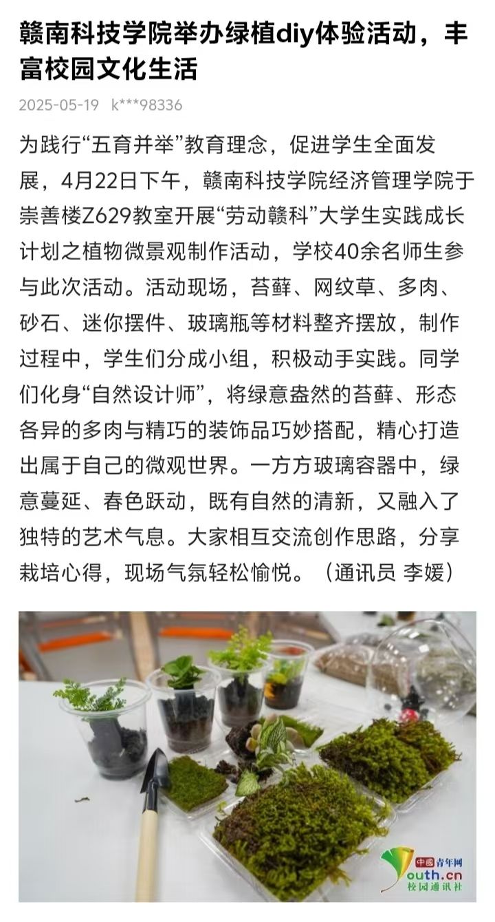 为践行“五育并举”教育理念,促进学生全面发展,4月22日下午,今年会官网今年会于崇善楼Z629教室开展“劳动赣科”大学生实践成长计划之植物微景观制作活动,学校40余名师生参与此次活动。活动现场,苔藓、网纹草、多肉、砂石、迷你摆件、玻璃瓶等材料整齐摆放,制作过程中,学生们分成小组,积极动手实践。同学们化身“自然设计师”,将绿意盎然的苔藓、形态各异的多肉与精巧的装饰品巧妙搭配,精心打造出属于自己的微观世界。一方方玻璃容器中,绿意蔓延、春色跃动,既有自然的清新,又融入了独特的艺术气息。大家相互交流创作思路,分享栽培心得,现场气氛轻松愉悦。(通讯员 李媛)
